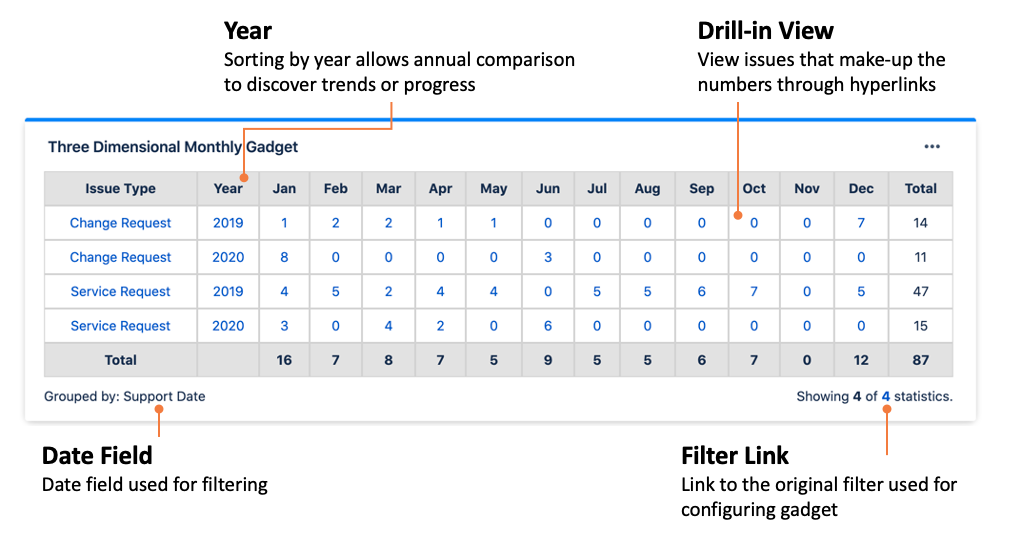 The Three Dimensional Monthly Gadget displays the breakdown of the issues (from the selected filter) across the months from the selected date field.