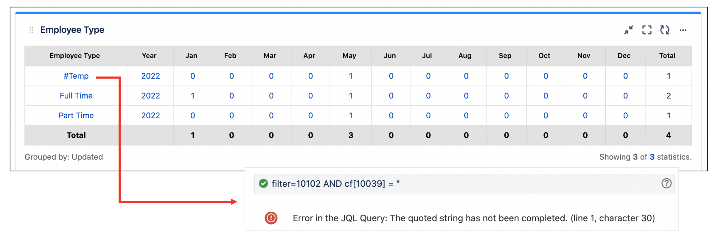 When clicked on the chart which links to the issue navigator, “Error in the JQL Query“ error message is displayed.