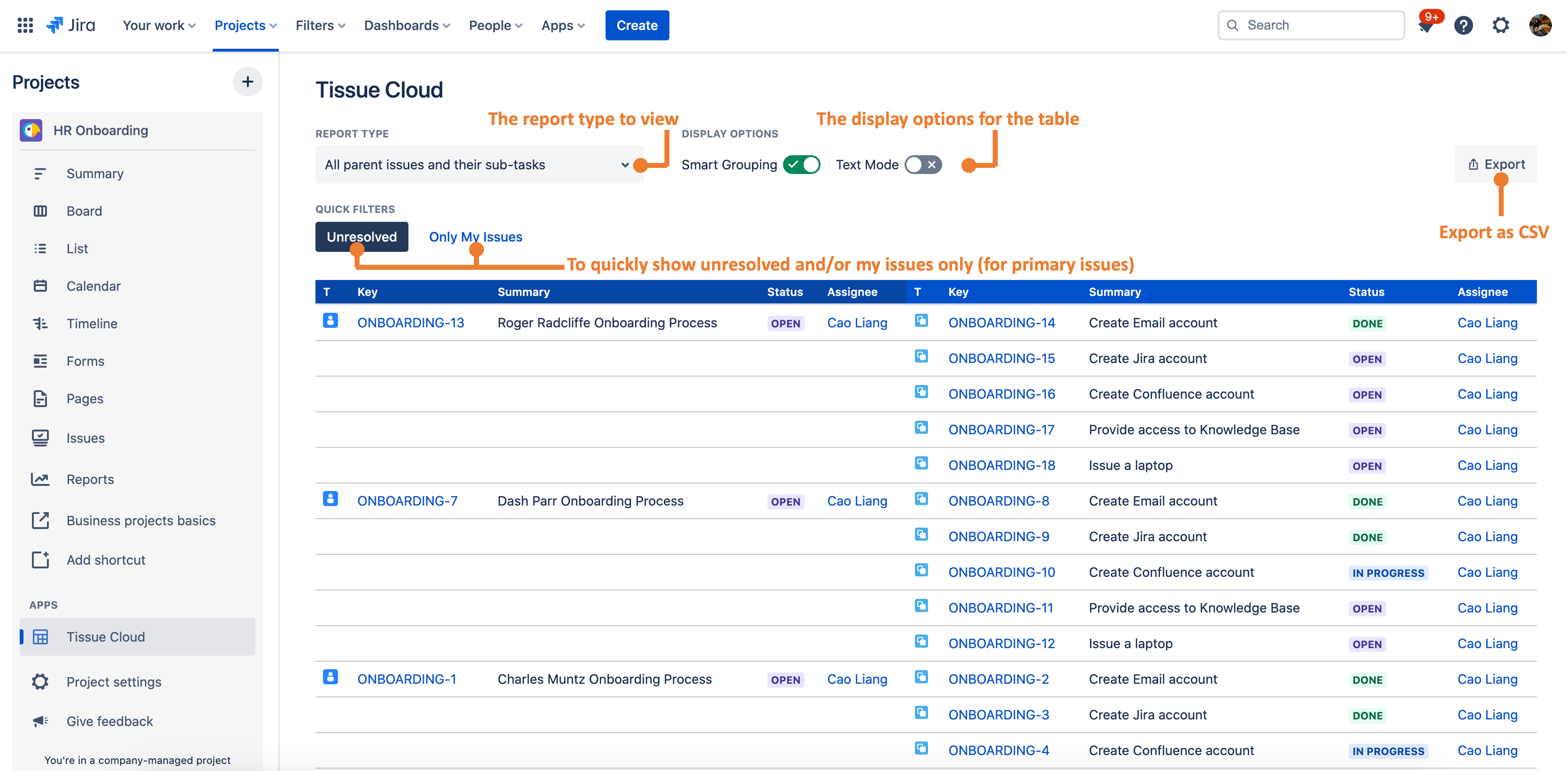 The Tissue Reports allows users to see clearly the relationship of the project issues by displaying them side by side within the same table.